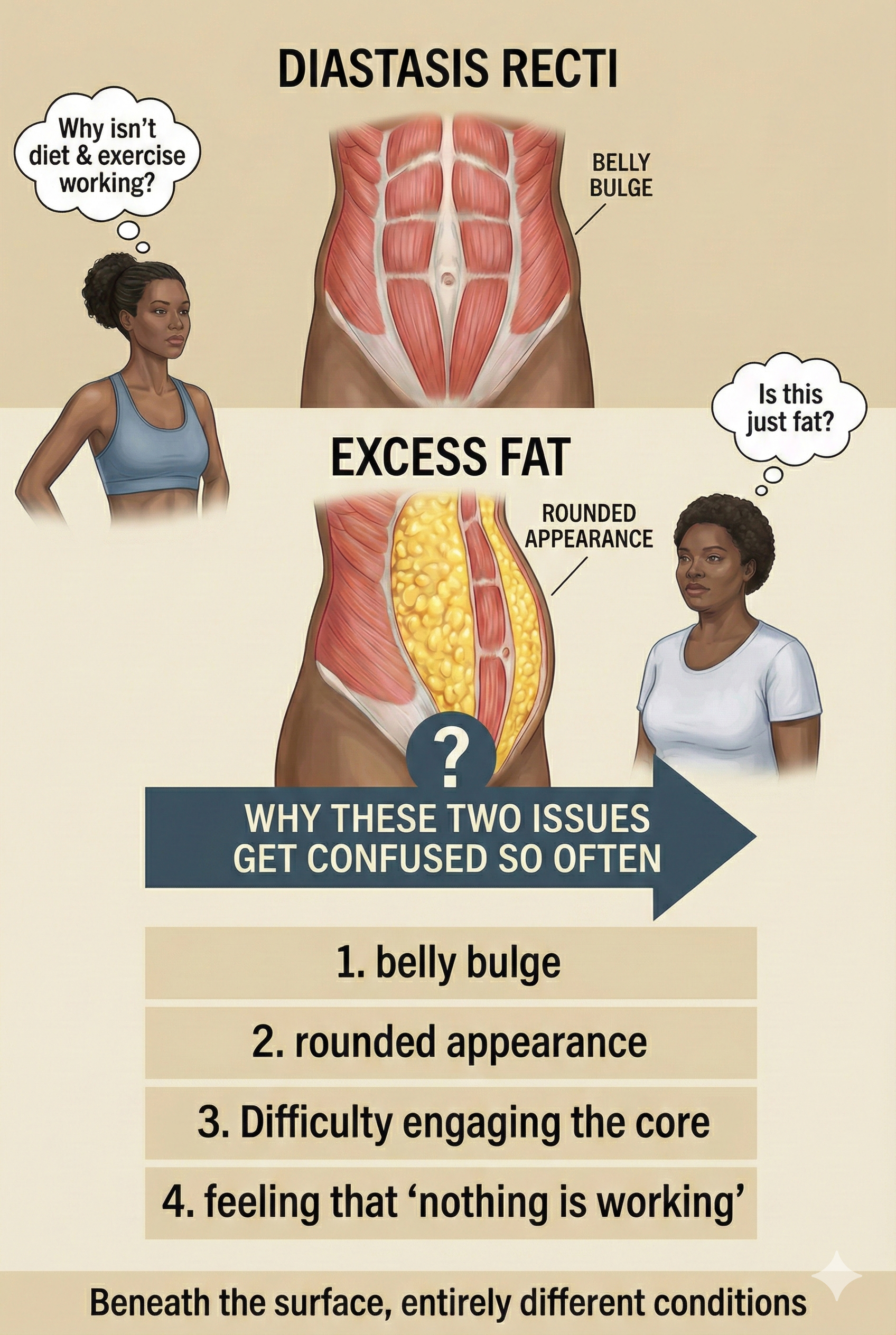 After pregnancy, weight changes, stretched skin, and hormonal shifts can all affect the abdomen. This makes it easy for diastasis recti to be mistaken for excess fat. Both can create: